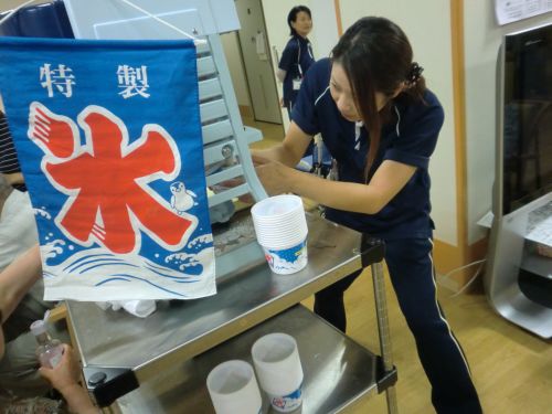 医療法人社団 三成会 南東北春日通所リハビリテーションでヒンヤリかき氷 2012.08.17(金) 夏といえば…氷水!!! ということで、8月8日(水)に南東北春日通所リハビリテーションにてかき氷の行事を行いました。本格的なかき氷器で作ったかき氷は皆さんに好評でした。イチゴにメロンにブルーハワイのシロップやトッピングにマンゴー、小豆、パイナップルと好きなものを選んで、様々な味を楽しまれていました。中には全種類をかけてのせるという強者もいました。「冷たい!」「おいしい!」と夏らしさを感じた日になりました。利用者も職員も一緒に楽しめたかき氷…また行いたいですね。