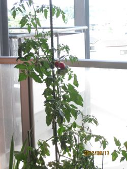 夏休みということもあり、前回より高校生が参加していただきました。前回の感想を伺うと、「普段より眠りが良くなった」「肩が軽くなった」とヨーガ・セラピーを体験して効果があったようです。 ヨーガ・セラピーは目を閉じて行います。自分のペースで気軽にできますので、1時間があっという間に感じていたようです。参加者さんと先生のヨーガ・セラピー前後のお話も楽しくしているようでした。9月も行いますので是非ご参加ください。 医療法人社団 三成会 老健だより ベランダに赤いトマトが実りました! 2012.08.18(土) 今年4月に植えたトマトの苗がどんどん大きくなり、真っ赤な赤い実がたくさんできました。利用者さんと小さなジョウロやコップを使い、毎日水遣りをして成長を楽しみにしていたので、トマトが次々と赤くなるにつれ喜びも大きくなりました。夏の太陽をめいっぱい浴びたトマトはとても甘くてみずみずしく、利用者さんもとれたてのトマトをほおばりながら、今年の夏は暑いからおいしいねとお話されていました。また、毎年夏にトマトを作っていたことを思い出したと懐かしい話に盛り上がりました。夏にしか食べられない旬のものを食べ、季節を感じることができました。トマトのように夏の暑さに負けず、元気に過ごして行きたいと思います。