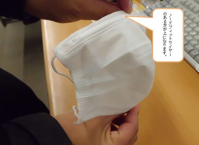 マスク着用で一番重要なポイントとして、不織布マスクの中にある針金を自分の鼻の形に合わせて折り曲げ、鼻の両脇の隙間をしっかりとふさいでください。