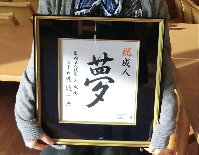 1月14日は成人の日。 本日の朝礼にて、渡邉一夫理事長から、南東北グループの成人を迎える職員へ、記念品の贈呈が行われました。