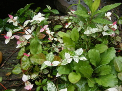 写真は健康チェックの様子とまちなかプラザ入口「しあわせの泉」で可憐に葉を揺らしていた初雪蔓(ハツユキカヅラ)です。初雪蔓はキョウチクトウ科テイカカズラ属の植物で日当たりの良いところを好みます。名前の由来は濃い緑に白い斑が散らばる葉の様子を、薄っすらと積もった初雪に見立てたことによるといわれています。雨に濡れてツヤツヤとした葉っぱがとても素敵でした。