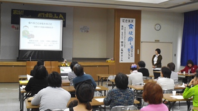 講師は当施設の田口美智子(管理栄養士)が務め、「食は命〜食べることは生きること〜」という演題でお話をさせて頂きました。