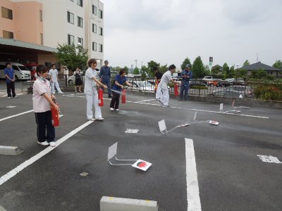 当日はあわせて消火訓練を行い、新人スタッフの皆さんも真剣な表情で取り組んでいました。