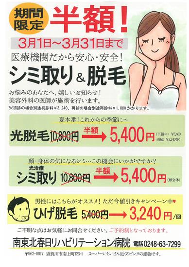 脱毛&シミ取り&ひげ脱毛〜半額キャンペーンを開催します!