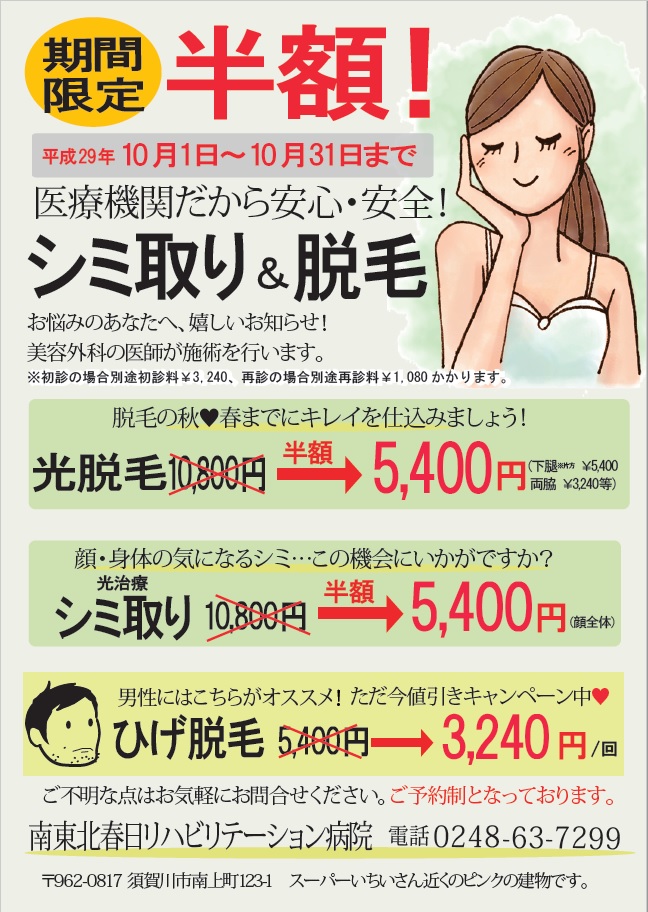 脱毛&シミ取り&ヒゲ脱毛〜半額キャンペーンのご案内♪
