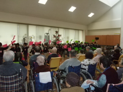 12月17日(水)午前10時から、和田幼稚園(須賀川市)の子供たちによるクリスマスお遊戯会が当施設2階の機能回復・レクリエーション室にて開催されました。子供達が元気いっぱい歌とダンスを披露すると、集まった利用者さんは手拍子で応援しながらお遊戯を楽しみました。クリスマスということで、会の最後にはサンタさんの代わりに利用者さんから子供達一人一人にプレゼントが手渡されました。外は寒いですが、子供達のかわいらしいダンスに心温まる時間を過ごすことができ、楽しいお遊戯会でした。和田幼稚園のみなさんありがとうございました!!