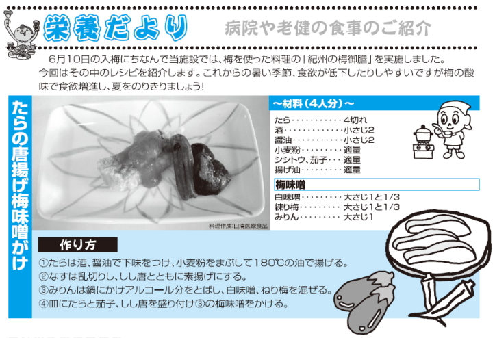 6月10日の入梅にちなんで当施設では、梅を使った料理の「紀州の梅御膳」を実施しました。今回はその中のレシピを紹介します。これからの暑い季節、食欲が低下したりしやすいですが梅の酸味で食欲増進し、夏をのりきりましょう!!