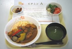 6月に実施した「ビタミンAたっぷり膳」を紹介します。ビタミンAでもβカロテンが多い食材を使いました。メインは素揚げしたかぼちゃやピーマンをトッピングしたカレーです。ごはんの黄色はにんじんをすりおろして炊いた”にんじんごはん”です。