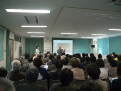 4月26日(土)午後2時から当施設5階会議室において「第8回健康教室」を開催しました。「パワーリハビリテーションについて」と題して、講師を理学療法士の平野氏が務めました。講義では寝たきりの原因や予防のためのパワーリハビリテーションに関して、当施設で行われている介護予防事業についてお話ししました。今回は前回を上回る約90人の方が参加、笑いを交えたわかりやすい内容に、みなさん興味深く聞き入っていました。
