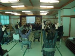2月24日(水)に浅川町社会福祉協議会において出前講座を行いました。「はじめよう介護予防-介護予防の知識と自宅で行える体操の実践-」をテーマに当施設の平野雄三氏(理学療法士)が講義を行いました。はじめに日本の高齢化社会を背景に話が進み、寝たきりになる原因を説明しました。年齢が高くなるほど転倒・骨折によって寝たきりになる方が増えていくことに講義を聞いた方は「なるほど」と真剣に聴講していました。後半には実際に自宅でも行える体操を皆さんと一緒に実践し、「身体が暖かくなった」、「肩こりが軽くなったように感じる」等運動の必要性を感じていただけました。