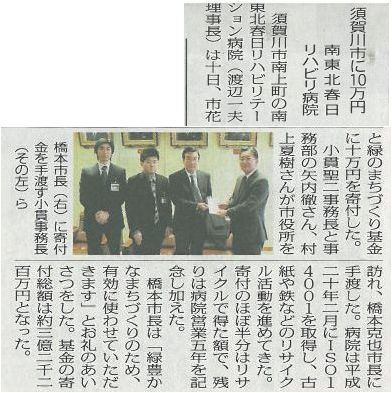 須賀川市南上町の南東北春日リハビリテーション病院(渡辺一夫理事長)は十日、市花と緑の町づくり基金に10万円を寄付した。小貫聖二事務長と事務部の矢内徹さん、村上夏樹さんが市役所を訪れ、橋本克也市長に手渡した。病院は平成20年2月にISO14001を取得し、古紙や鉄などのリサイクル活動を進めてきた。寄付のほぼ半分はリサイクルで得た額で、残りは病院営業5年を記念し加えた。
