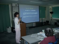 「尿失禁対策について」当施設の菊池看護管理マネージャーが講演し、尿失禁は女性の方を中心におよそ20代〜50代の3・4人に1人の方が尿失禁に悩んでいるといわれ、予防対策として膀胱や尿道を支える筋肉を鍛える体操療法などのアドバイスがあり、普段の生活で適切な治療があれば、快適な生活を取り戻せるとお話がありました。恥ずかしからずに是非相談して頂ければと思います。