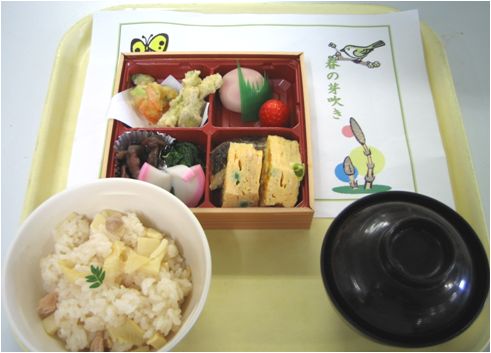 まだ寒い日が続きますが、お彼岸に合わせて「春の芽吹き弁当」を実施しました。福島ではまだまだ筍は出回りませんが、たけのこ御飯やたらの芽の天ぷらなど春を先取りした食材を使いました。写真ではわかりにくいかもしれませんが、かまぼこも蝶々の形に切ってあります。入院・入所されている患者さんや利用者さんに少しでも春を感じて頂ければと思います。