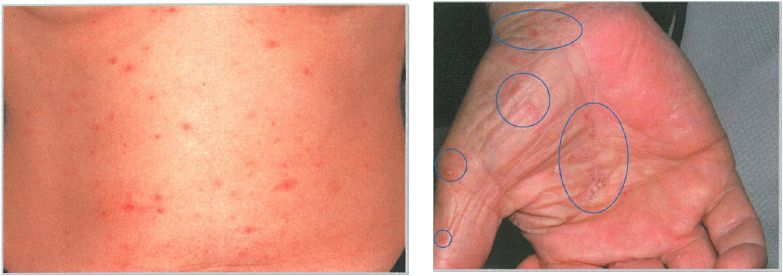 ヒゼンダニ(疥癬虫)というたいへん小さなダニの一種が、皮膚に寄生しておこる「かゆみ」を伴う皮膚の病気(皮膚感染症)です。