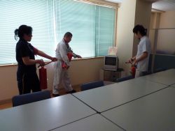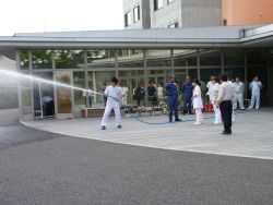 5月25日(火)、須賀川消防署協力のもと、病院・介護老人保健施設合同の避難訓練を行いました。3階家族会議室から火災発生という設定で、火災警報機発報・火元確認・初期消火・消防署への通報・非常放送・避難誘導の一連の流れを訓練しました。当院はリハビリテーション施設ということで、車椅子や足の不自由な患者さんも多く、迅速・安全に避難誘導するためにも、スタッフ間の連携・的確な判断が必要です。万一、火災が発生した場合に大切な患者さんを守るため、日頃からよく話し合い、今後も訓練を重ねることが大切だと感じました。また避難後には散水栓、消火器の使い方も教わりました。聞いているだけではなかなか覚えることができませんでしたが、今回は実践で行われたので体験できてすごく勉強になりました。職員それぞれが訓練の重要性を感じた避難訓練でした。