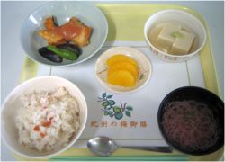 梅雨に入りじめじめとした日が続きます。今回は入梅にちなんで、「紀州の梅御膳」と題し、梅を使った献立にしました。暑い時期、食欲が低下した時でも梅の酸味でさっぱりと頂けます。中でも”じゃこ御飯”は夏バテでごはんがすすまない時でもおいしく食べられ簡単にできるのでおススメです。