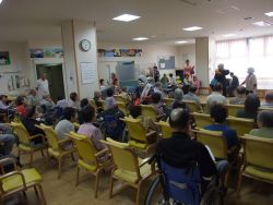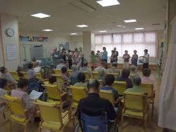 7月14日(水)に春日通所リハビリテーションで、江口幸子歌謡教室・遊歌カラオケ同好会様によるカラオケと踊りの慰問がありました。総勢15名のみなさんがそれぞれ豪華な衣装で登場。歌や踊り、尺八など練習の成果を披露していただきました。演目は「瀬戸の花嫁」「百年桜」「夫婦舟」等お馴染みの曲を多く取り入れた構成になっており、利用者さんも一緒に歌って参加できるように考慮していただきました。曲の途中で涙する利用者さんや、大きく手拍子をする方など大変な盛り上がりとなりました。最後に全員で「とんがり帽子」を歌い楽しいひと時を過ごすことができました。また慰問に来て下さい!!