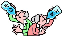 この季節は汗をかきやすいので脱水や熱中症に注意して下さい。とりわけ、高齢者は脱水になりやすいので注意が必要です。高齢者の一日の必要水分摂取量は1000〜1500mlといわれています。しかし、一度に多量の水を飲むのは苦痛ですので、こまめに飲むことがポイントになります。特にお風呂や運動の前には水分を摂るように心掛けてください。また、寝ている間にも水分は失われていくので、就寝前にも飲んでおきたいところです。