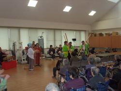 日本民謡協会須賀川支部さんは毎年12月に慰問に来ていただいており、今年は総勢18名による9演目の民謡・舞踊です。はじめは民謡の黒田節、斉太郎節を披露していただき、舞踊では二輪草、愛のままでなどを指先までの繊細な踊りでとても綺麗な演舞でした。演奏が館内に響いて、次第に観客が増えて最終的には60名を超えて会場は満員御礼!!みなさんの手拍子、「良かったよ」等の声も出したり、最後の演目の「会津餅つき唄」では職員や入所者さんの演出もあり大変盛り上がりました。入所者さんをはじめ、みんな一緒に楽しい時間を過ごすことができました。日本民謡協会須賀川支部の皆さん本当にありがとうございました。