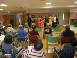 12月21日(火)、病棟にて江口幸子歌謡教室・遊歌カラオケ同好会のみなさんによるカラオケの慰問がありました。みなさん華やかな衣装で登場!!最初に江口幸子さんが「あんたの大阪」を熱唱!!「ここに幸あり」「高原列車は行く」などや「花笠音頭」の踊り、計13曲披露して頂き、患者さんも、手拍子や口ずさんだりと楽しんでいました。最後に「星影のワルツ」を全員で歌い、懐かしい曲に患者さんや家族さんも盛りあがっていました。