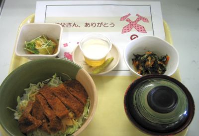 6月の第3日曜日は『父の日』です。この日は父の日に合わせたメニューを・・・と考え、がっつりとカツ丼メニューにしました。カツ丼は会津若松のB級グルメで有名な”ソースカツ丼”にしてみました。生ビールも添えてありますが、中身はりんごジュースで作った甘いゼリーです。