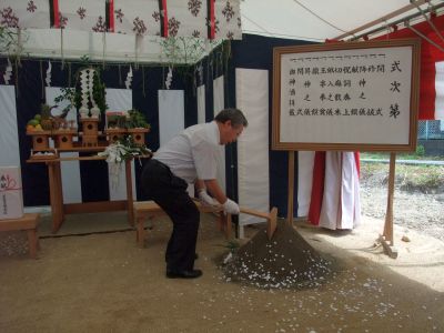 好天に恵まれた同祭には、医療法人社団三成会職員はじめ地主様、須賀川信用金庫代表、工事関係者ら20人が出席、神事に続き同三成会の渡邉一夫理事長、後藤恒夫南東北春日リハビリテーション病院長らが鍬入れ、玉串をささげて工事の安全と無事を祈りました。