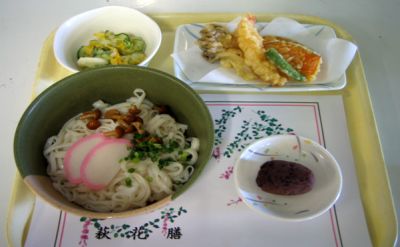 暑さ寒さも彼岸までと言いますが、お彼岸を迎えてようやく涼しくなってきました。今日は秋のお彼岸にちなみ、おはぎや天ぷらなどの献立です。メインは稲庭うどん。長崎の五島うどん、香川の讃岐うどんと共に日本三大うどんのひとつです。稲庭うどんは秋田県南部の手延べうどんで、平べったい形と滑らかな食感が特徴です。