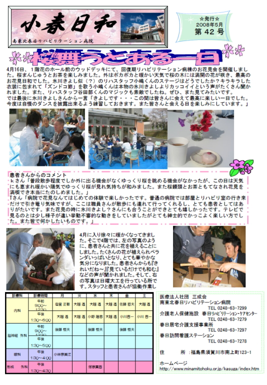 この他、お花見イベント・新入職員の紹介・栄養だより等掲載しております。小春日和第42号、ぜひご覧下さい!